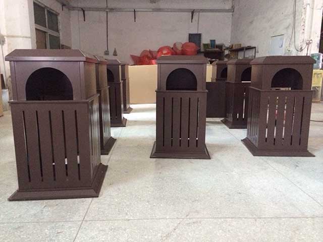 欣方圳別墅垃圾桶經裁剪——折彎——氬弧焊焊接成型,再經酸洗磷化——靜電噴塑;確保桶體的戶外防銹能力和抗腐蝕性能;。